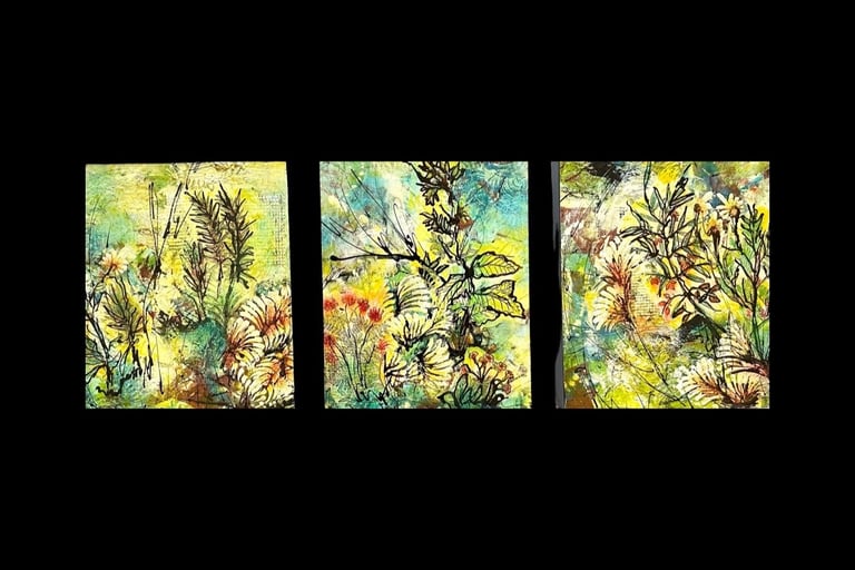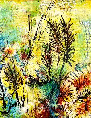 Mixed Media using acrylic paints and inks, collage on paper. Piece is laminated onto birch cradle board.