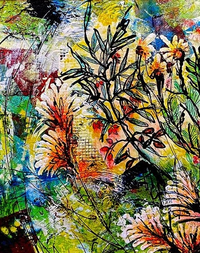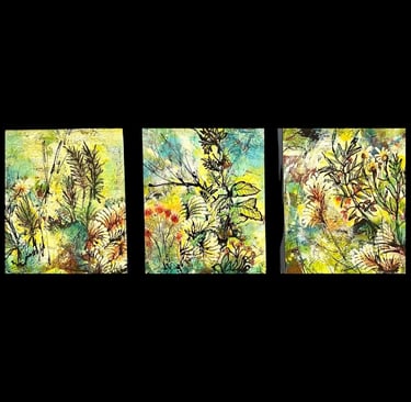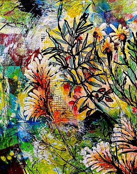 Mixed Media using acrylic paints and inks, collage on paper. Piece is laminated onto birch cradle board.