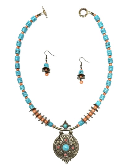 Necklace and earrings fashioned with Chinese turquoise, coral,brass disks and tibetan brass pendant. Includes a Gold plated toggle clasp.
