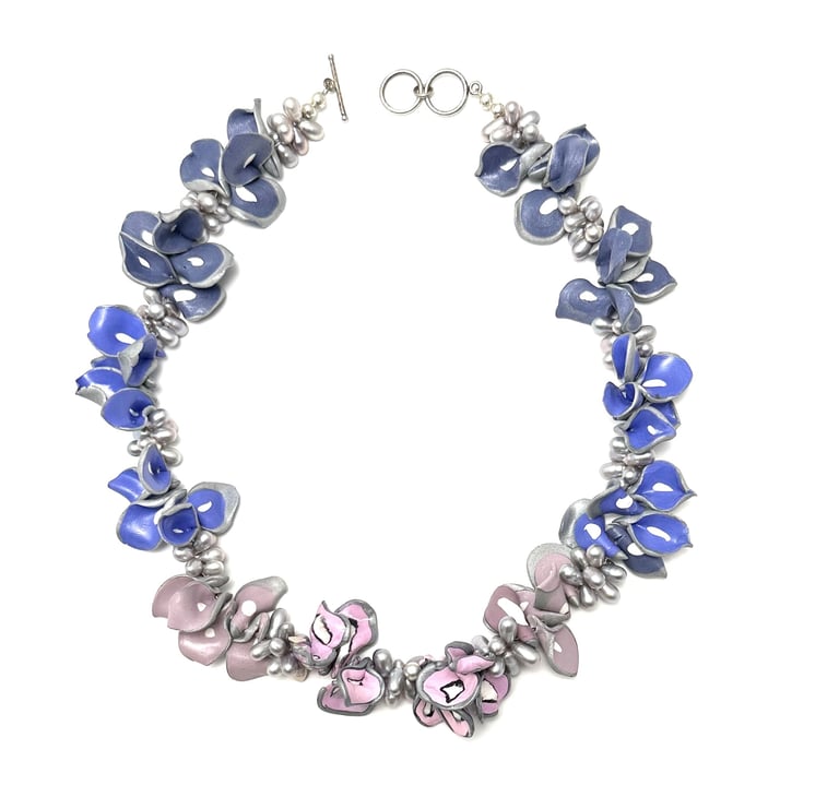 Necklace handcrafted using polymer clay buds made by artist. Piece also includes freshwater pearls and is finished with a Sterling silver adjustable toggle clasp