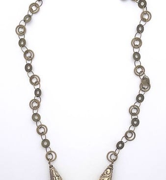 This chain necklace is a unique piece that features Nepalese silver and glass beads, as well as a vintage Middle Eastern pendant. The combination of these elements create an eye-catching design that is sure to make a statement. With no clasp, this necklace simply fits over the neck, making it easy to wear and adding to its effortless, bohemian charm. The cultural influences displayed in this necklace make it a truly special and distinctive accessory.