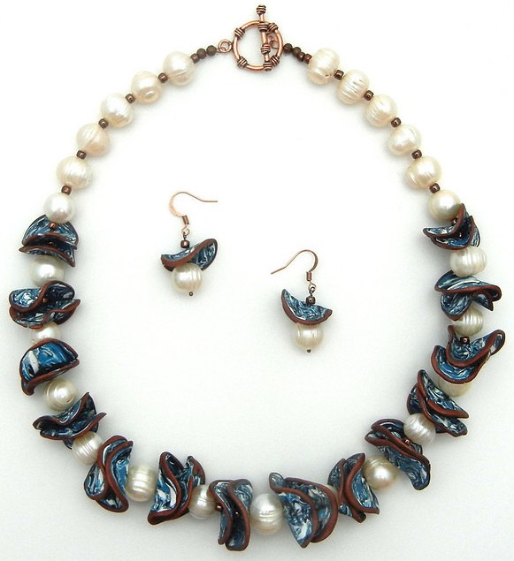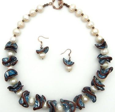 This set includes a necklace and earrings that showcase handcrafted polymer clay shapes created by the artist. These unique forms are beautifully combined with freshwater pearls, adding an elegant touch to the overall design. The set is completed with a copper toggle clasp. The attention to detail and craftsmanship make this jewelry set truly special.