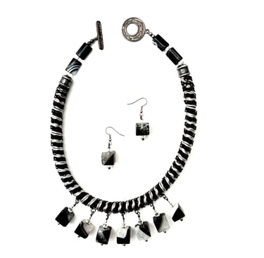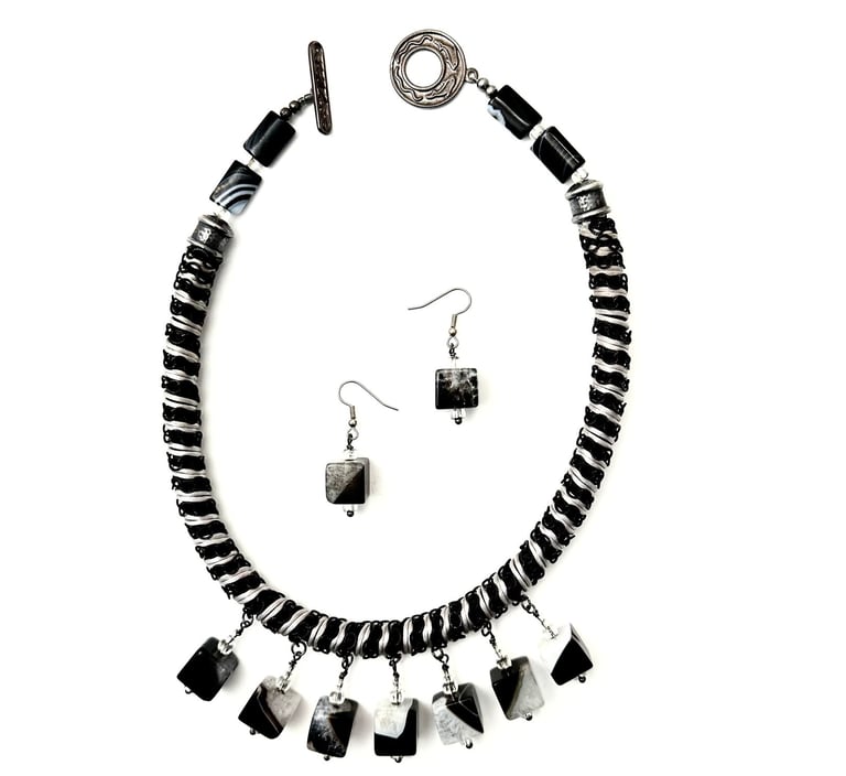 This classy contemporary choker set includes a necklace and earrings, both handmade using unique agate cubes, satin cord, and chain; It is finished with a pewter toggle clasp. The set is a good choice for adding a touch of sophistication and elegance to any wardrobe