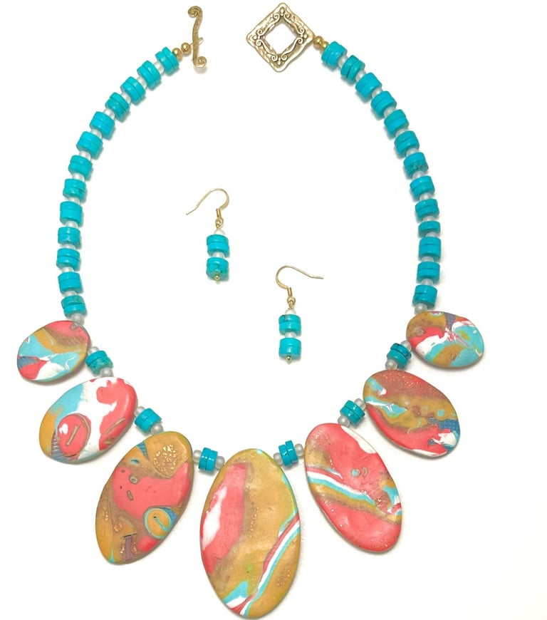 This set features a unique combination of Chinese turquoise beads and polymer clay focal drops handmade by the artist. Piece is finished with a bronze toggle clasp. The vibrant turquoise and earthy polymer clay create a beautiful contrast which is perfect for complimenting brown, blue or white outfits.