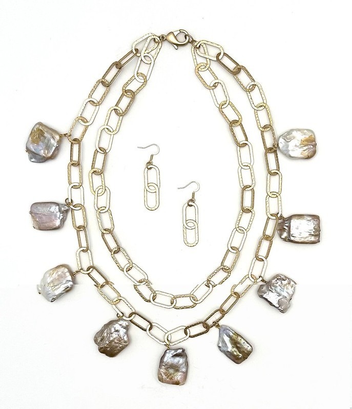 Beautiful necklace and earrings crafted using freshwater pearls and a gold plated chain Finished with a gold plated lobster clasp.