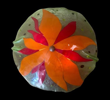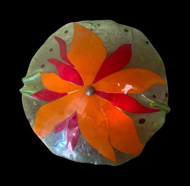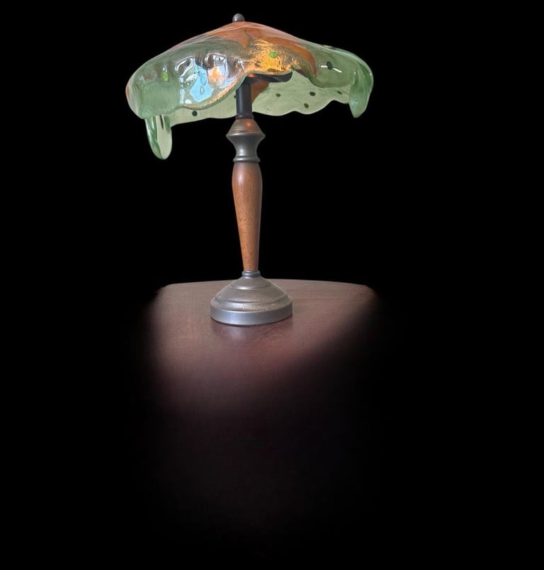 One of a kind fused glass lamp shade. green with orange and yellow leaf design. lamp shade has a touch switch. May be purchased with lamp stand or without.