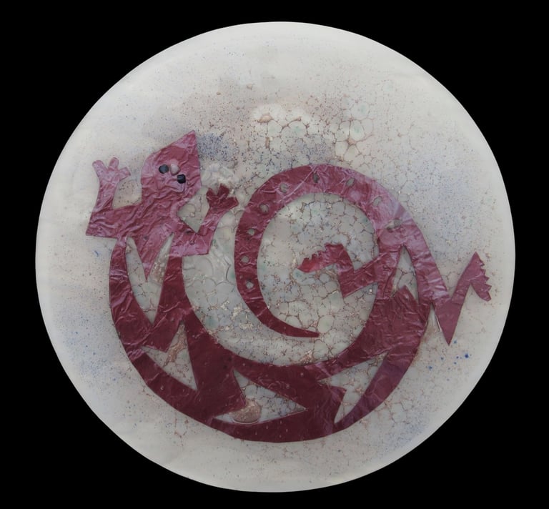 This decorative disk is a unique and eye-catching piece of art. The 12" fused glass disk features a copper foil lizard petroglyph fused between two layers of glass, creating a stunning and one-of-a-kind design. Included display stand