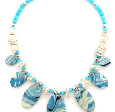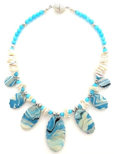 Thes necklace is made of polymer clay focal beads,hand crafted by artist. They are complemented by beautiful jade stones, delicate freshwater pearls, and shimmering silver plated beads. The combination of these elements creates the oceanic theme for which the piece is named. . To ensure easy wear, the necklace is finished with a convenient magnetic clasp. It is a perfect accessory to compliment any casual wear especially ones in blues, blacks or whites.