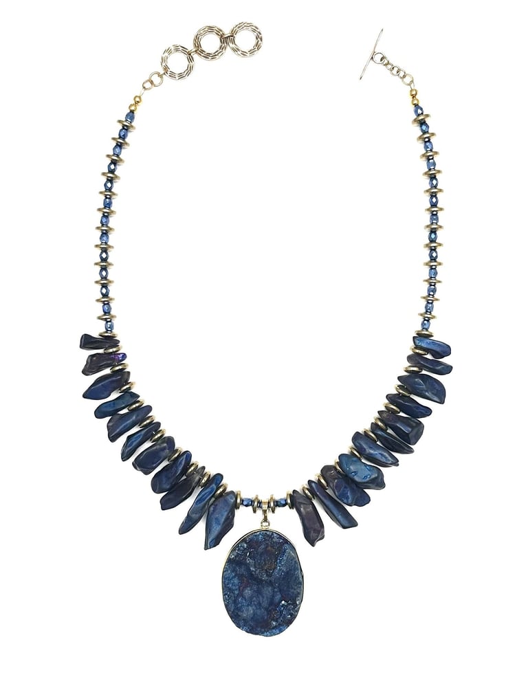 Unique crafted necklace made with iridized pyrite, drusy pendant,czech crystal and hematitebeads. finished with an adjustable bronze toggle clasp