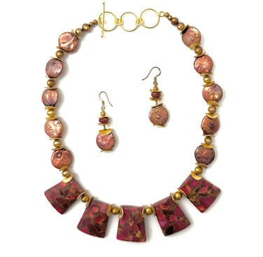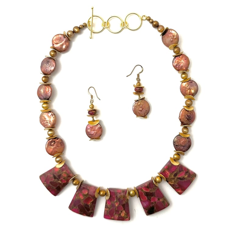 This exquisite necklace and earrings set is handcrafted using terrazzo gold plated discs, 5 genuine terrazzo stones, and freshwater pearls. The combination of these materials creates a stunning and unique design that is sure to make a statement. The necklace features an adjustable toggle clasp, allowing you to find the perfect fit. The terrazzo stones add a touch of elegance and sophistication, while the freshwater pearls bring a timeless beauty. Whether you're attending a special event or simply want to add a touch of luxury to your everyday look,