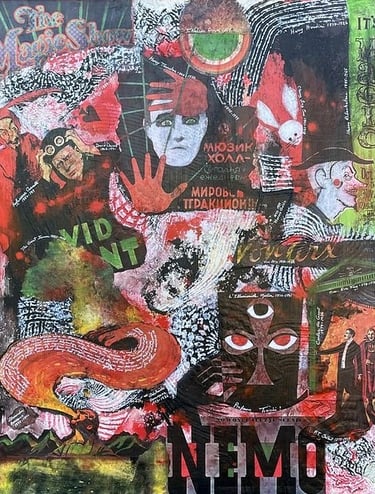 Mixes media using various hand painted drawings photographs and acrylic paint on a panel